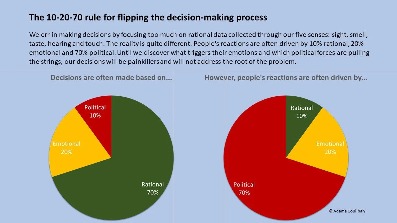 In such a context, you must flip the conventional 70-20-10 framework into a 10-20-70 because people's reactions are often dictated by 10% rational, 20% emotional and 70% political. And until we know what drives their emotions and what political forces are at stake, our decisions are painkillers that don't address the root cause of the problem.